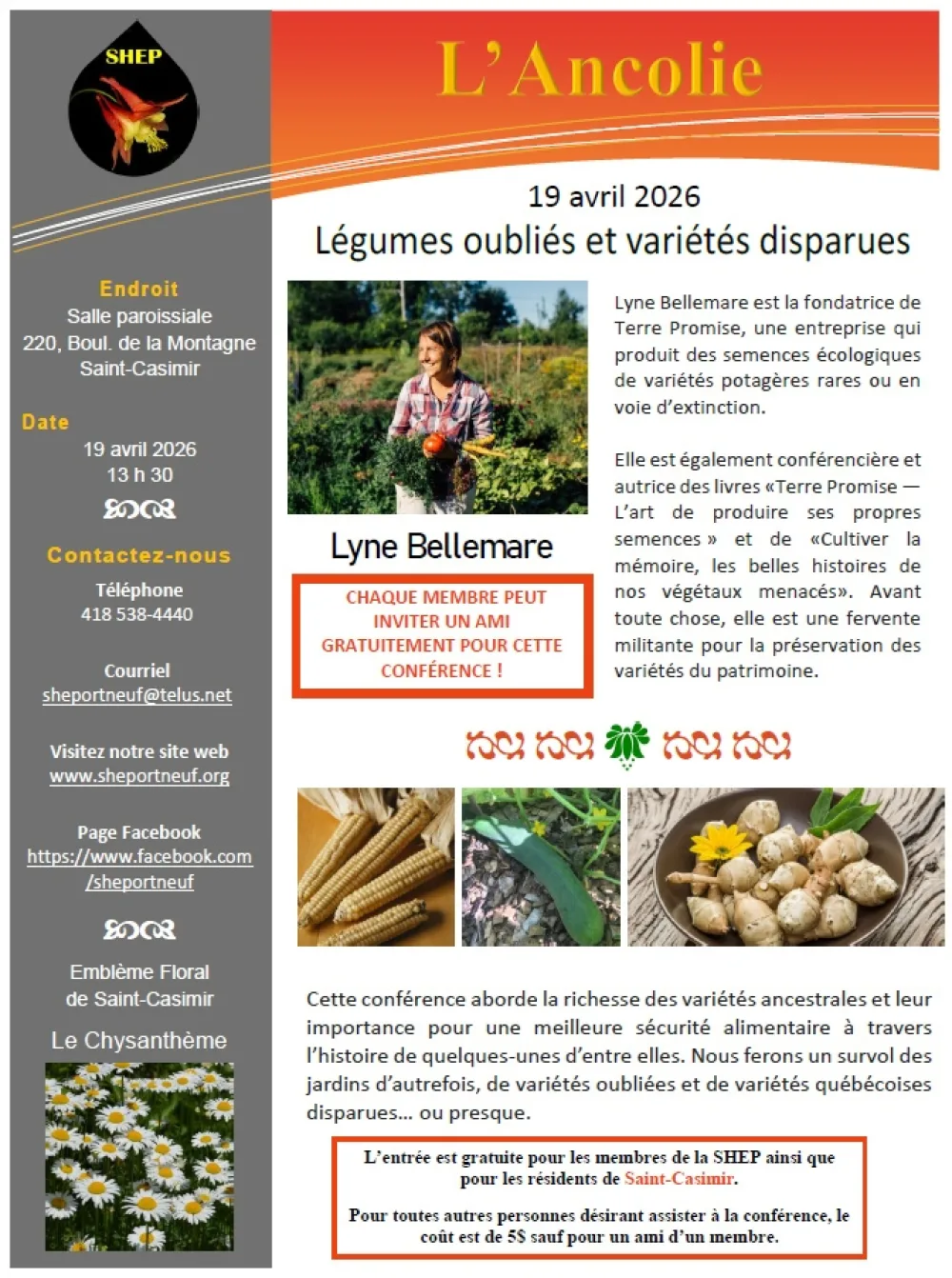 - La conférence « Légumes oubliés et variétés disparues » sera animée par Mme. Lyne Bellemare.